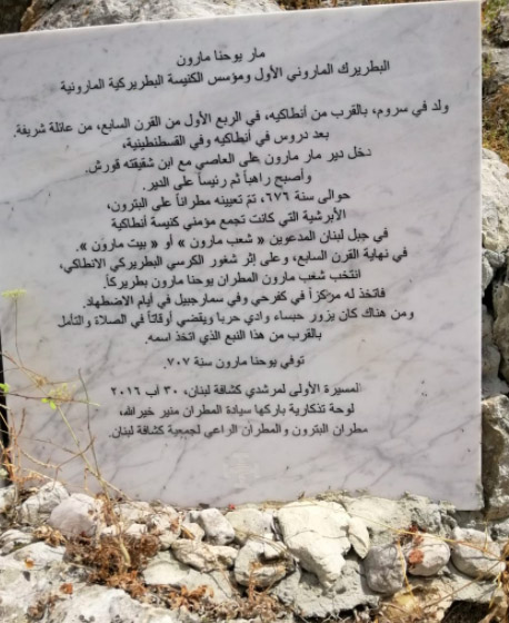 في زاوية الوادي، قبل أن تصل الى الطريق العام، حجر صغير يؤرخ "البطريرك الماروني الأول ومؤسس الكنيسة البطريركية" الآتي الى البترون من مسالك نهر "العاصي"...