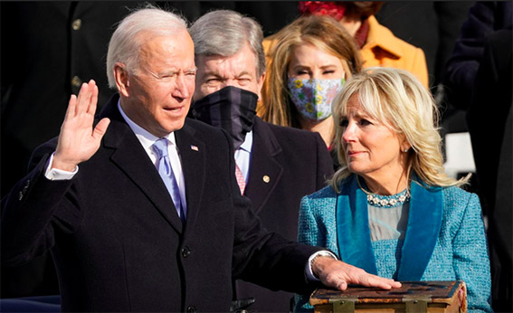بايدن وفي خطاب أداء اليمين الدستورية تعهد" بإنهاء الحرب غير المدنية" في بلاده المنقسمة بشدة، وتعاني من اقتصاد متهالك ووباء فيروس كورونا الذي قتل ٤٠٠ألف أميركي.