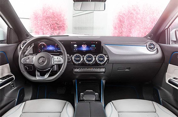 هنا ، تستمر اللمسات البارزة باللونين الأزرق والذهبي الوردي في تزيين التصميم الداخلي لمرسيدس بنز EQA ، حتى شاشات العرض.