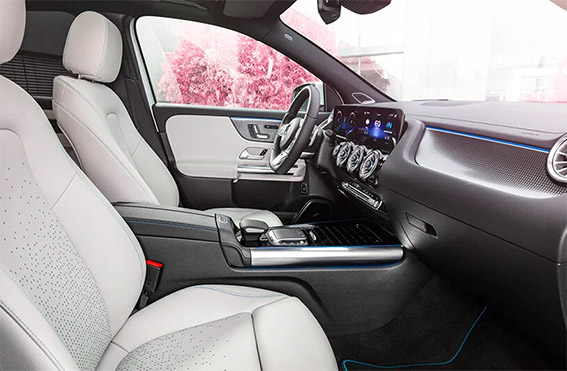 تهيمن وحدة العرض المستقلة - مثل GLA - على جانب السائق من لوحة القيادة ، بينما تحدد القواطع ذات النهاية الحلزونية جانب الراكب.