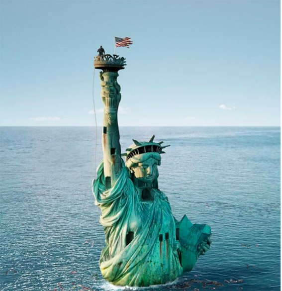 يستخدم الفنان الرقمي الفرنسي فابيان بارو التصوير الفوتوغرافي بطائرة بدون طيار الخاصة به لعمل مونتاج للصور لكيفية ظهور الهندسة المعمارية المدمرة بعد نهاية العالم بسبب تغير المناخ.
