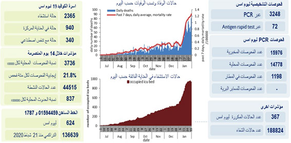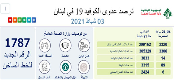 أعلنت وزارة الصحة العامة تسجيل ٣٣٢٠اصابة جديدة بكورونا و٨٩حالة وفاة خلال الساعات ال٢٤ ساعة الماضية.