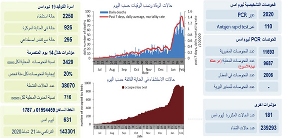 اعلنت وزارة الصحة العامة تسجيل 2130 اصابة جديدة رفعت العدد التراكمي للحالات المثبتة الى 339122. كما تم تسجيل 32 حالة وفاة.