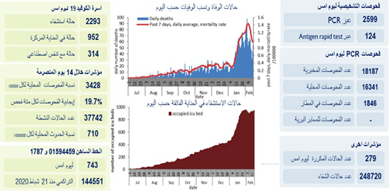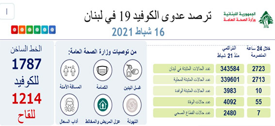 .اعلنت وزارة الصحة العامة تسجيل 2723 اصابة جديدة رفعت العدد التراكمي للحالات المثبتة الى 343584. كما تم تسجيل 55 حالة وفاة