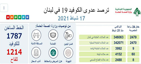 .اعلنت وزارة الصحة العامة تسجيل 2479 اصابة جديدة رفعت العدد التراكمي للحالات المثبتة الى 346063. كما تم تسجيل 60 حالة وفاة