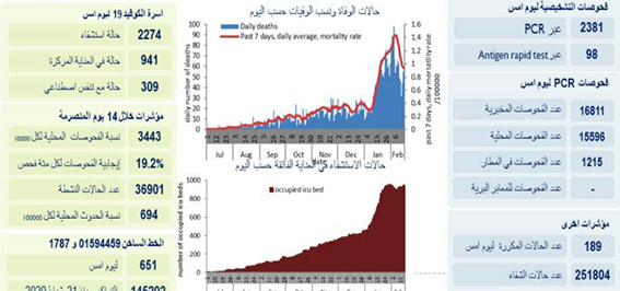 اعلنت وزارة الصحة العامة تسجيل 2479 اصابة جديدة رفعت العدد التراكمي للحالات المثبتة الى 346063. كما تم تسجيل 60 حالة وفاة.