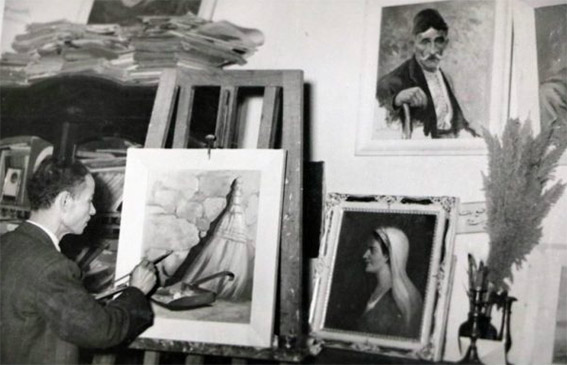 يرسم في محترفه.