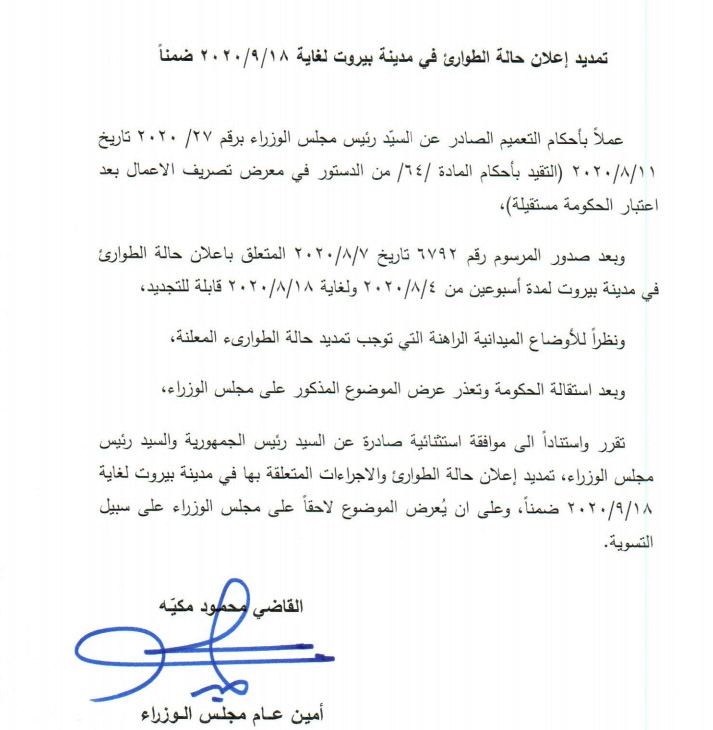اعلنت رئاسة مجلس الوزراء تمديد اعلان حالة الطوارىء في بيروت لغاية 18 ايلول المقبل