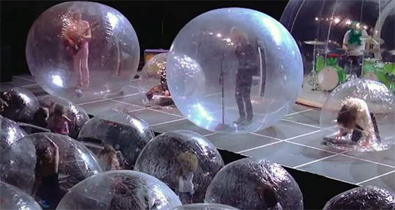 واعتمدت لتأمين التباعد الاجتماعي طريقة تغليف أعضاء الفرقة والجمهور بفقاعات بلاستيكية عملاقة.