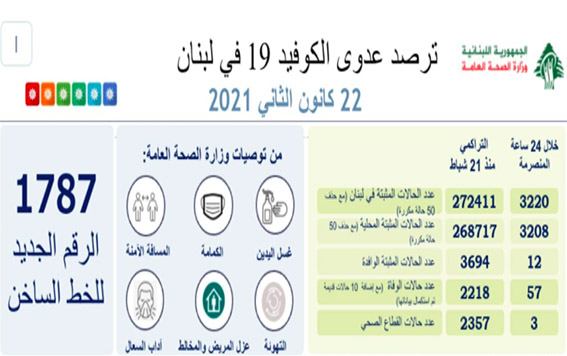 .اعلنت وزارة الصحة العامة تسجيل 3220 اصابة كورونا جديدة رفعت العدد التراكمي للحالات المثبتة ال 269241. كما تم تسجيل 57 حالة وفاة