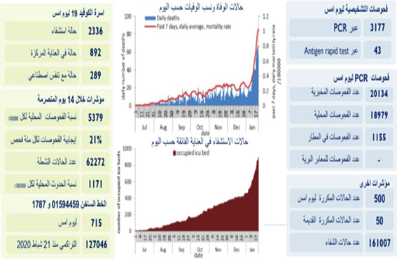اعلنت وزارة الصحة العامة تسجيل 3220 اصابة كورونا جديدة رفعت العدد التراكمي للحالات المثبتة ال 269241. كما تم تسجيل 57 حالة وفاة.