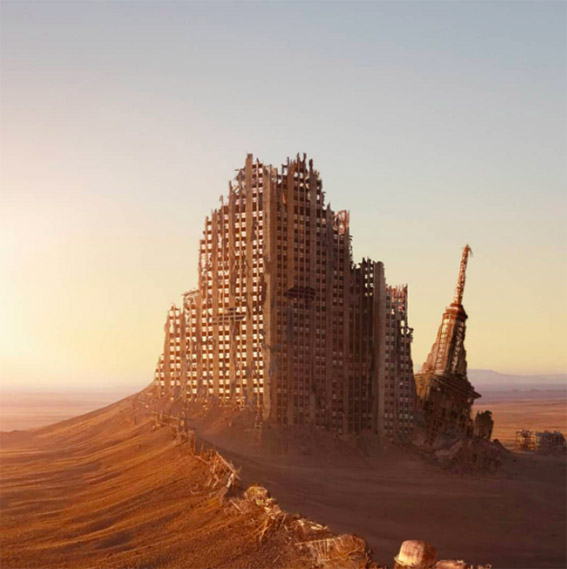 يستخدم الفنان الرقمي الفرنسي فابيان بارو التصوير الفوتوغرافي بطائرة بدون طيار الخاصة به لعمل مونتاج للصور لكيفية ظهور الهندسة المعمارية المدمرة بعد نهاية العالم بسبب تغير المناخ.