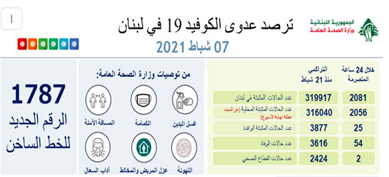 .اعلنت وزارة الصحة العامة تسجيل 2081 اصابة جديدة رفعت العدد التراكمي للحالات المثبتة الى 319917. كما تم تسجيل 54 حالة وفاة