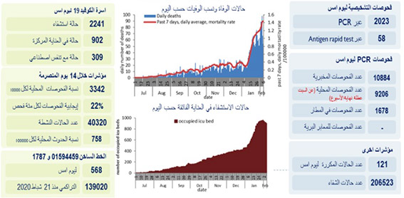 اعلنت وزارة الصحة العامة تسجيل 2081 اصابة جديدة رفعت العدد التراكمي للحالات المثبتة الى 319917. كما تم تسجيل 54 حالة وفاة.