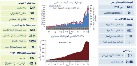 اعلنت وزارة الصحة العامة تسجيل 3157 اصابة جديدة رفعت العدد التراكمي للحالات المثبتة الى 328016. كما تم تسجيل 66 حالة وفاة.