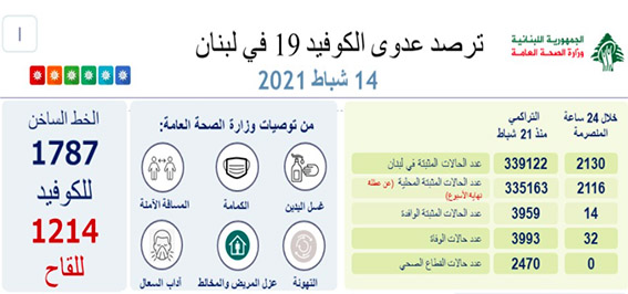 اعلنت وزارة الصحة العامة تسجيل 2130 اصابة جديدة رفعت العدد التراكمي للحالات المثبتة الى 339122. كما تم تسجيل 32 حالة وفاة.